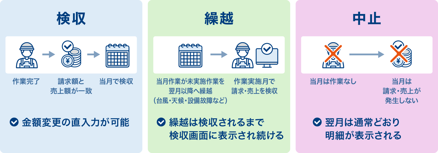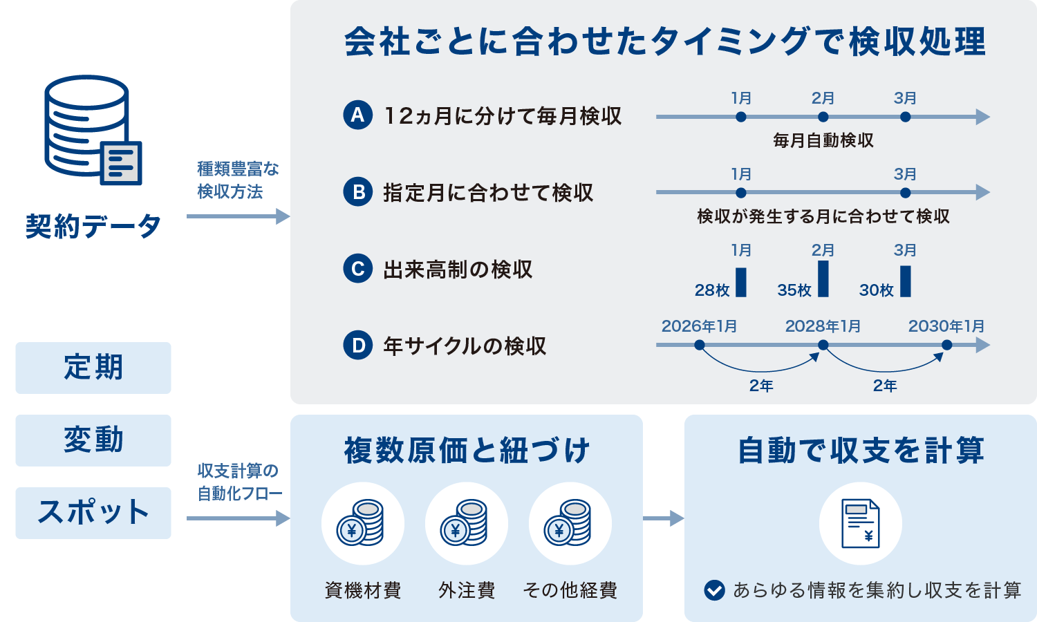 定期契約・変動契約・臨時契約といった契約形態に応じて、検収の有無を柔軟に設定可能です。