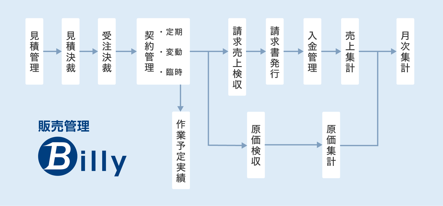 Billyは、見積管理から月次集計までの販売管理の業務はもちろん、作業予定実績の管理機能も兼ね備えたビルメンテナンス業向けの販売管理システムとなります。こういったビルメンテナンスの業務に特化した機能が充実しているため、スムーズに運用することが可能です。