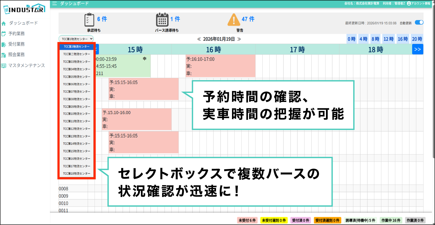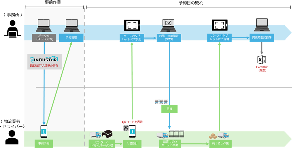 バースの事前予約・ドライバーの受付・バース誘導・荷待ちと荷役時間の集計などを行います。