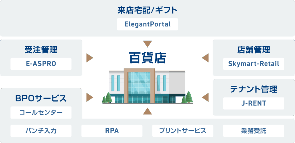 東計電算は、百貨店の各部門が抱える異なる課題に対して、最適な業務パッケージを組み合わせ、部門間のデータ連携を含めた“トータルソリューション”としてご提案します。